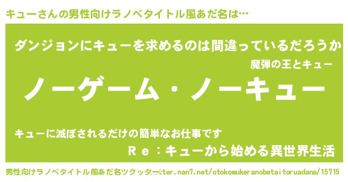 | 女子向けラノベタイトル風あだ名 | 『死神キューの再婚』 |