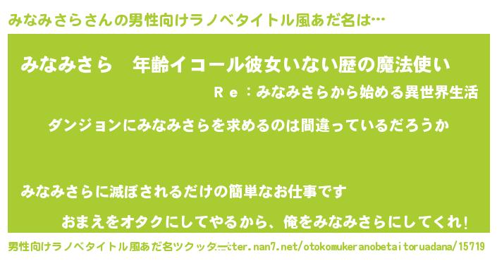 | 女子向けラノベタイトル風あだ名 | 『みなみさらの卵を拾いまして』 |