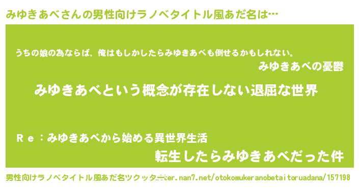 | 女子向けラノベタイトル風あだ名 | 『異世界で失敗しない100のみゆきあべ』 |
