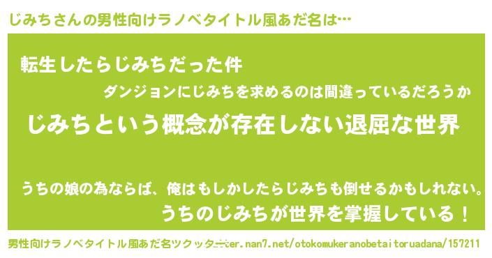 | 女子向けラノベタイトル風あだ名 | 『異世界で失敗しない100のじみち』 |