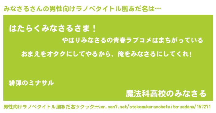 | 女子向けラノベタイトル風あだ名 | 『みなさる夫妻のなれそめ』 |