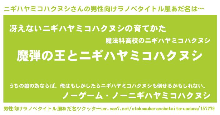 | 欧米人風あだ名 | 『ダレノガレニギハヤミコハクヌシ』 |