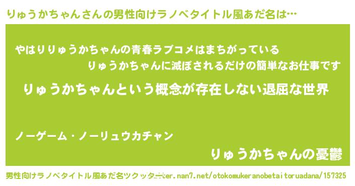 | 女子向けラノベタイトル風あだ名 | 『異世界で失敗しない100のりゅうかちゃん』 |