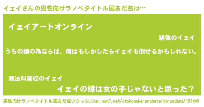 | 女子向けラノベタイトル風あだ名 | 『イェイ伯爵の花嫁』『イェイ様がみてる』 |