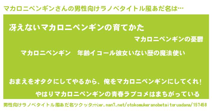 | 女子向けラノベタイトル風あだ名 | 『マカロニペンギンの玉の輿計画!』 |