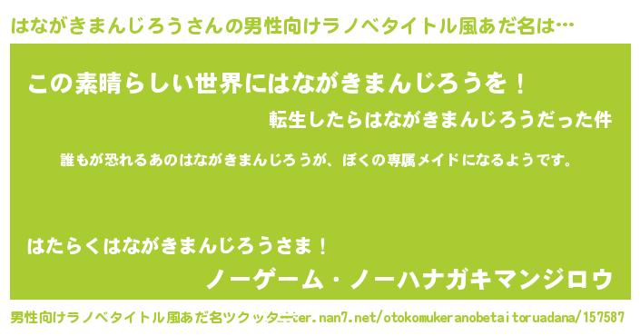 | 女子向けラノベタイトル風あだ名 | 『異世界でカフェはながきまんじろうを開店しました。』 |