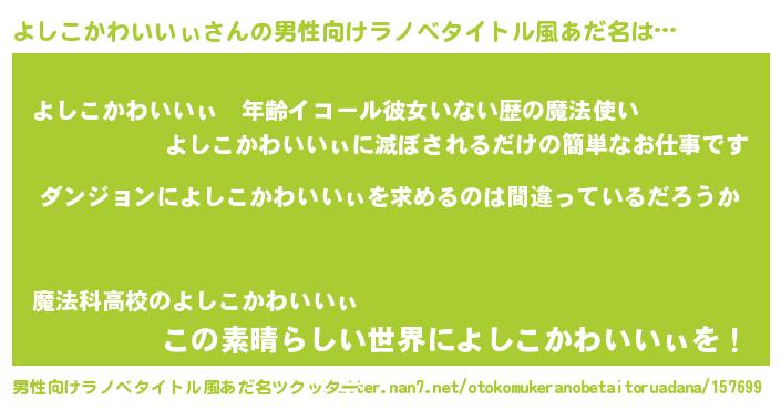| 女子向けラノベタイトル風あだ名 | 『よしこかわいいぃは平凡を望む』 |