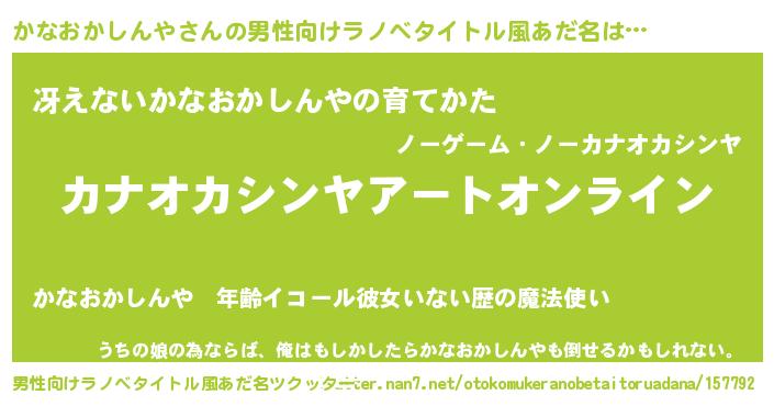 | 胡散臭い通販商品みたいなあだ名 | 『億万長者になれるブレスレット…その名も「かなおかしんや」』 |