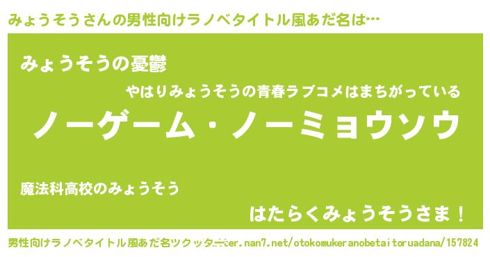 | 女子向けラノベタイトル風あだ名 | 『死神みょうそうの再婚』 |