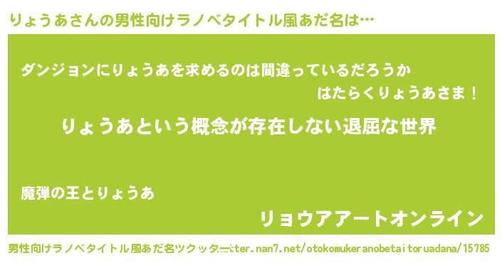 | 女子向けラノベタイトル風あだ名 | 『異世界で失敗しない100のりょうあ』 |