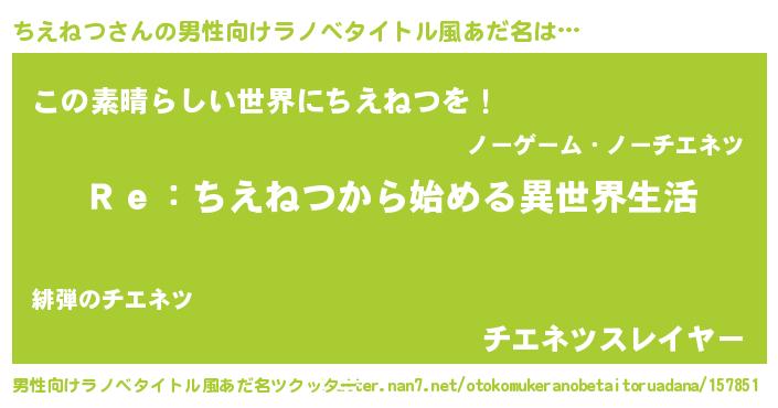 | 女子向けラノベタイトル風あだ名 | 『闇のちえねつ』『死神ちえねつの再婚』 |