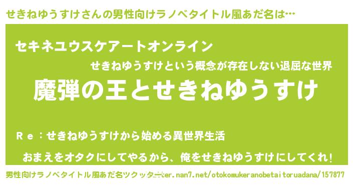 | 女子向けラノベタイトル風あだ名 | 『乙女ゲームの破滅フラグしかない悪役せきねゆうすけに転生してしまった…』 |