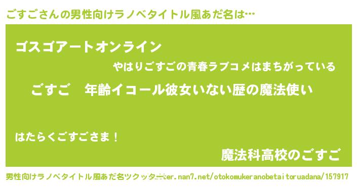 | 女子向けラノベタイトル風あだ名 | 『ごすごの玉の輿計画!』 |