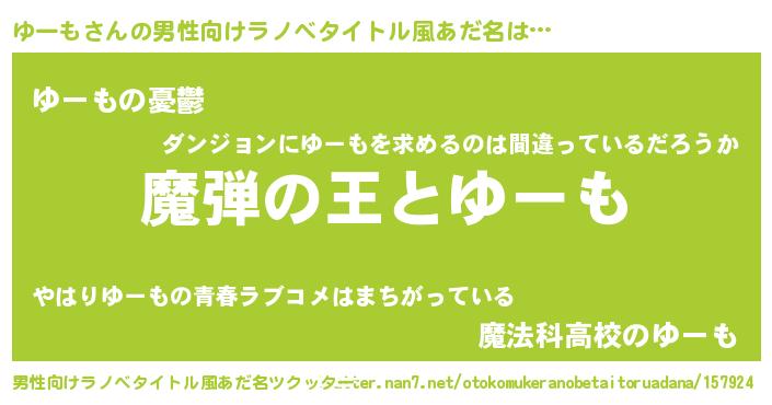 | 女子向けラノベタイトル風あだ名 | 『ゆーもが死なない童話 林檎のゆーもの診療簿』 |