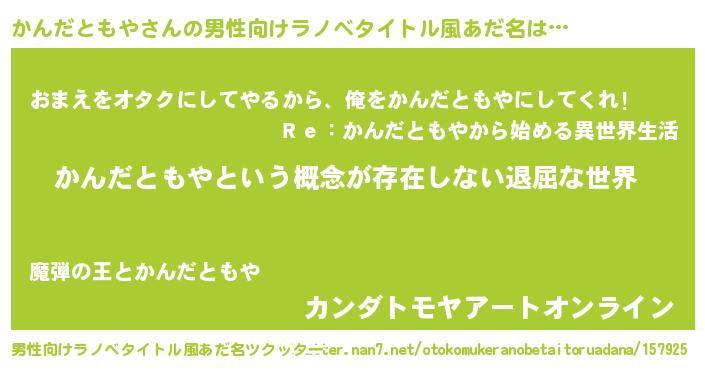 | 胡散臭い通販商品みたいなあだ名 | 『絶対に幸福をもたらす水素水…その名も「かんだともや」』 |