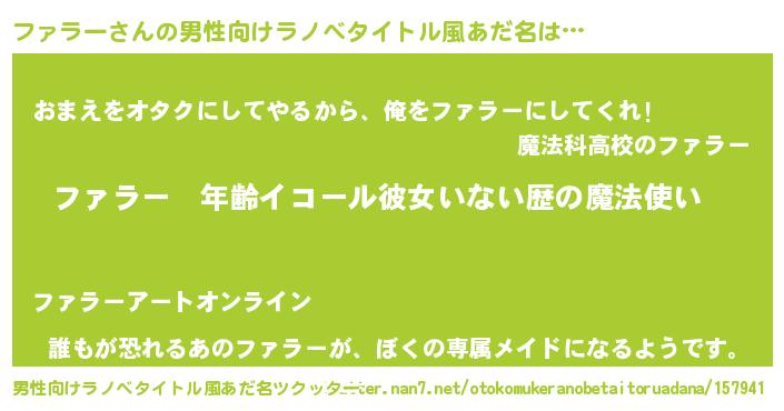 | 女子向けラノベタイトル風あだ名 | 『ファラーの玉の輿計画!』 |