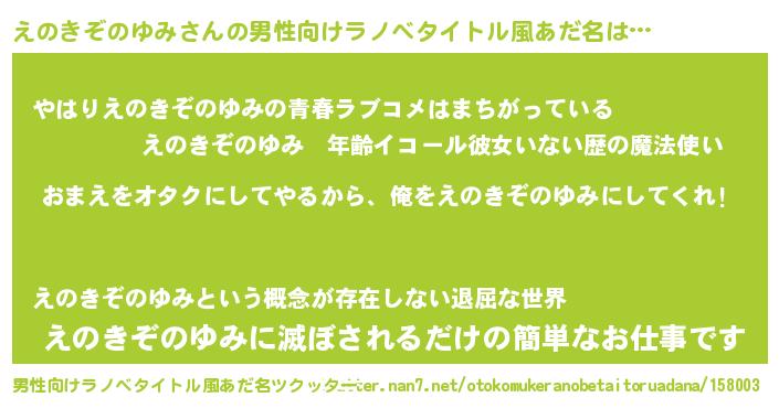 | 女子向けラノベタイトル風あだ名 | 『えのきぞのゆみ夫妻のなれそめ』 |