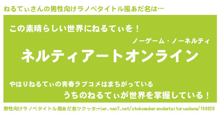 | 女子向けラノベタイトル風あだ名 | 『ねるてぃ姫と円卓の騎士』 |