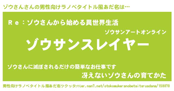 | ヒーロー風カッコイイあだ名 | 『超時空戦士ゾウサン』『魔戒騎士ゾウ』 |
