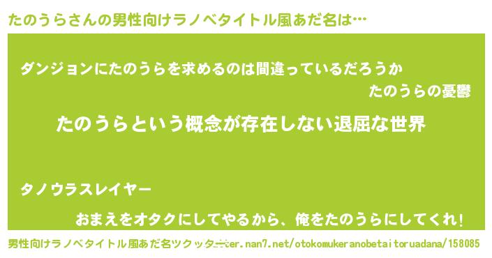 | 女子向けラノベタイトル風あだ名 | 『たのうらの契約王妃』『たのうら恋絵巻』 |