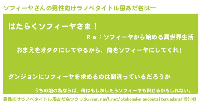 | 女子向けラノベタイトル風あだ名 | 『ソフィーヤ夫妻のなれそめ』 |