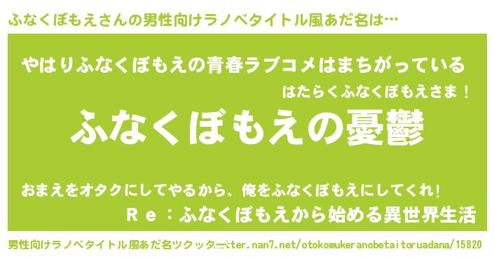 | 女子向けラノベタイトル風あだ名 | 『(仮)ふなくぼもえのやんごとなき事情』 |