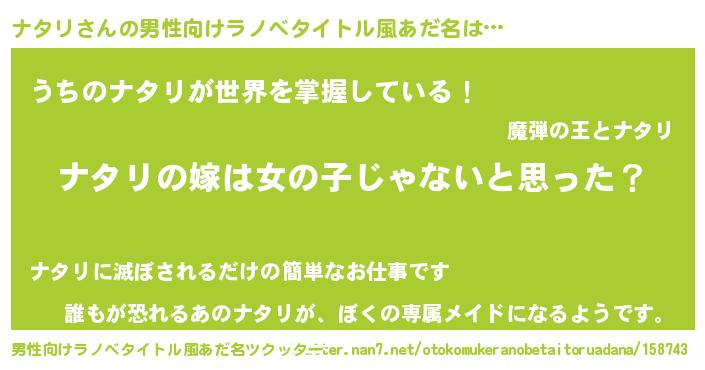 | 女子向けラノベタイトル風あだ名 | 『ナタリ様がみてる』『ナタリの契約王妃』 |
