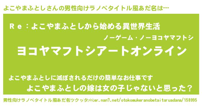 | 女子向けラノベタイトル風あだ名 | 『よこやまふとし姫と円卓の騎士』 |
