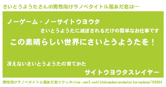 | 女子向けラノベタイトル風あだ名 | 『乙女ゲームの破滅フラグしかない悪役さいとうようたに転生してしまった…』 |