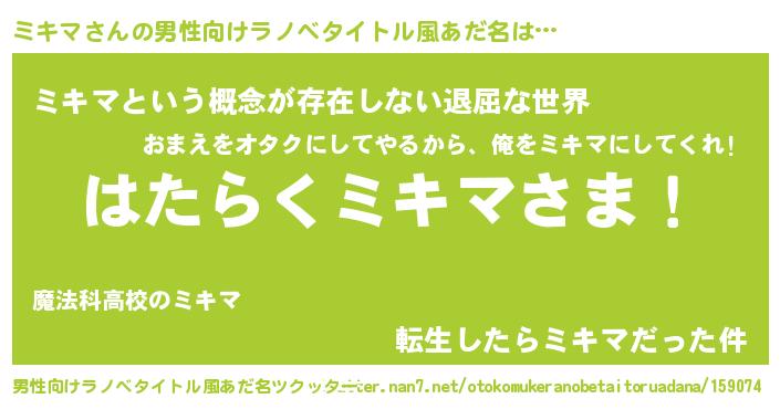 | 胡散臭い通販商品みたいなあだ名 | 『来世でも幸せになれる健康食品…その名も「ミキマ」』 |