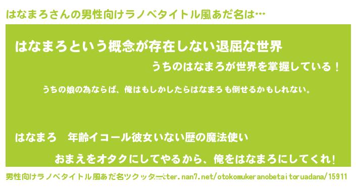 | 女子向けラノベタイトル風あだ名 | 『はなまろ伯爵の花嫁』『はなまろ恋絵巻』 |