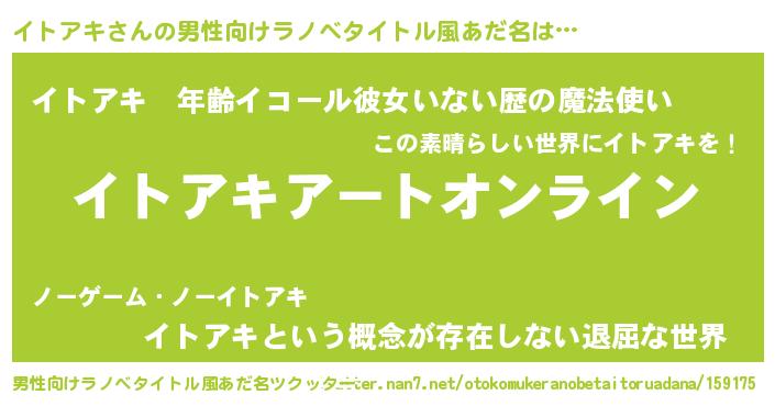 | 胡散臭い通販商品みたいなあだ名 | 『モテモテ間違いなしブレスレット…その名も「イトアキ」』 |