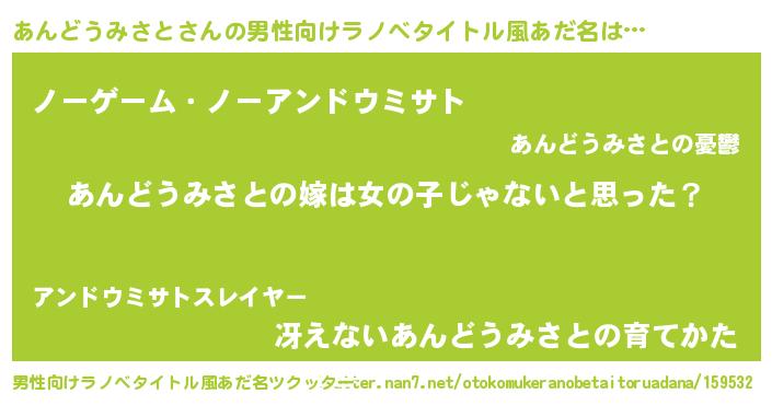 | 女子向けラノベタイトル風あだ名 | 『あんどうみさとの卵を拾いまして』 |
