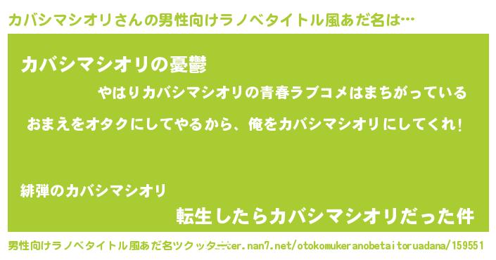 | 女子向けラノベタイトル風あだ名 | 『カバシマシオリ夫妻のなれそめ』 |