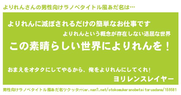 | 女子向けラノベタイトル風あだ名 | 『乙女ゲームの破滅フラグしかない悪役よりれんに転生してしまった…』 |