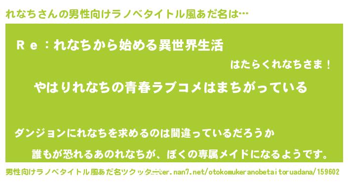 | 女子向けラノベタイトル風あだ名 | 『れなちの雑貨屋さん』『闇のれなち』 |