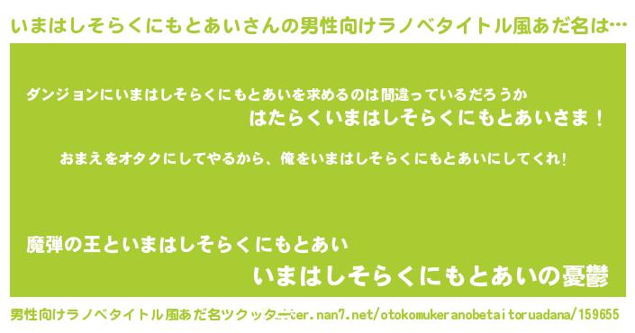 | 女子向けラノベタイトル風あだ名 | 『いまはしそらくにもとあい夫妻のなれそめ』 |