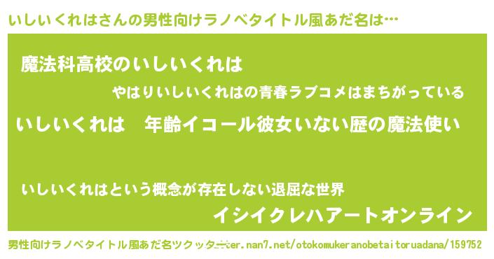 | 女子向けラノベタイトル風あだ名 | 『いしいくれはの玉の輿計画!』 |