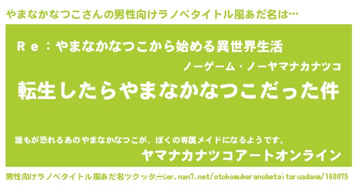 | 女子向けラノベタイトル風あだ名 | 『やまなかなつこの玉の輿計画!』 |
