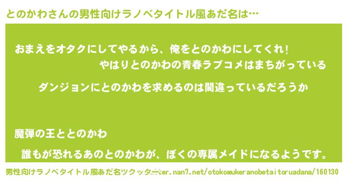 | 女子向けラノベタイトル風あだ名 | 『とのかわは平凡を望む』 |