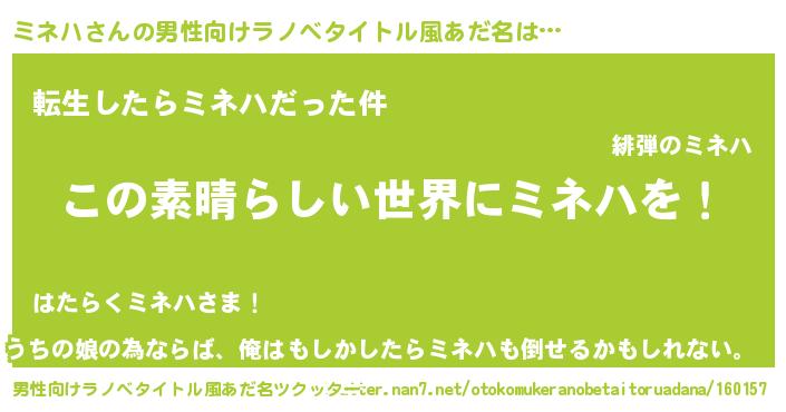 | 女子向けラノベタイトル風あだ名 | 『悪役ミネハに転生したようですが、知った事ではありません』 |