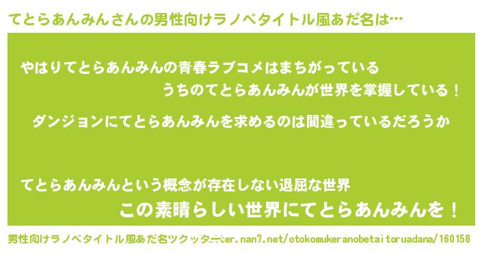 | 女子向けラノベタイトル風あだ名 | 『てとらあんみんの卵を拾いまして』 |
