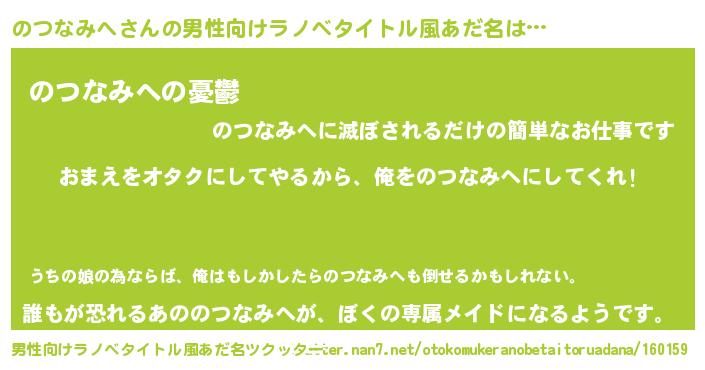 | 女子向けラノベタイトル風あだ名 | 『のつなみへ夫妻のなれそめ』 |