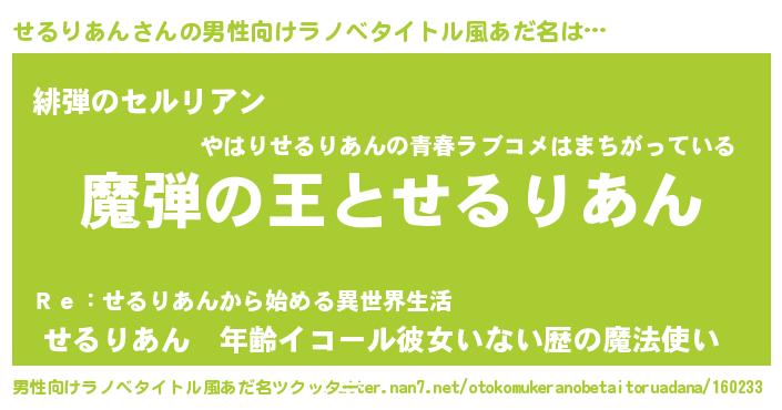 | 女子向けラノベタイトル風あだ名 | 『せるりあんが死なない童話 林檎のせるりあんの診療簿』 |