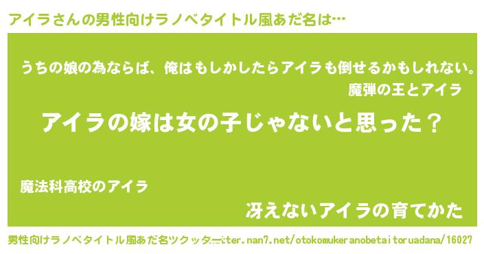 | 女子向けラノベタイトル風あだ名 | 『アイラ様がみてる』『アイラの婚約者』 |