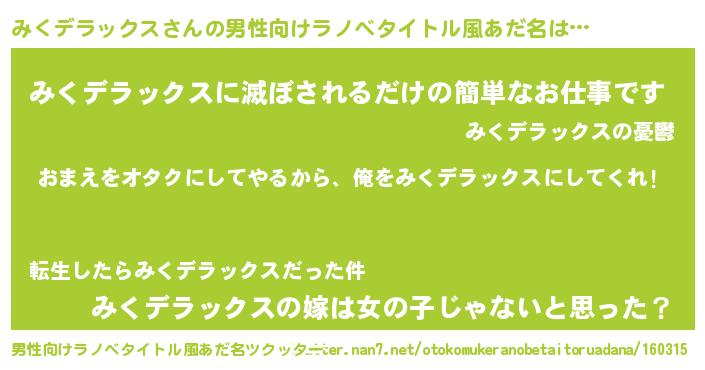 | 女子向けラノベタイトル風あだ名 | 『みくデラックス夫妻のなれそめ』 |