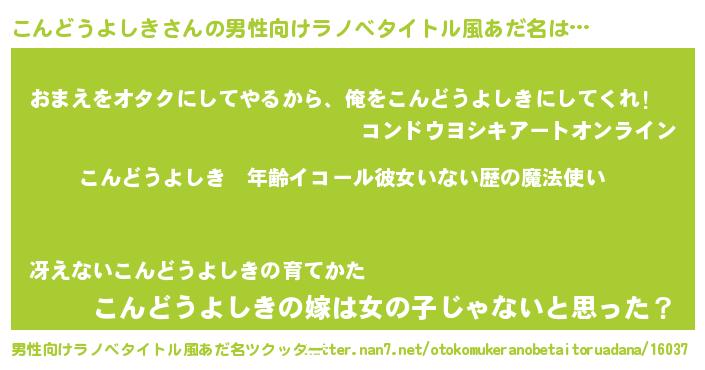 | 女子向けラノベタイトル風あだ名 | 『こんどうよしきの玉の輿計画!』 |