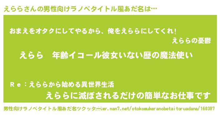 | 女子向けラノベタイトル風あだ名 | 『えららの玉の輿計画!』『闇のえらら』 |