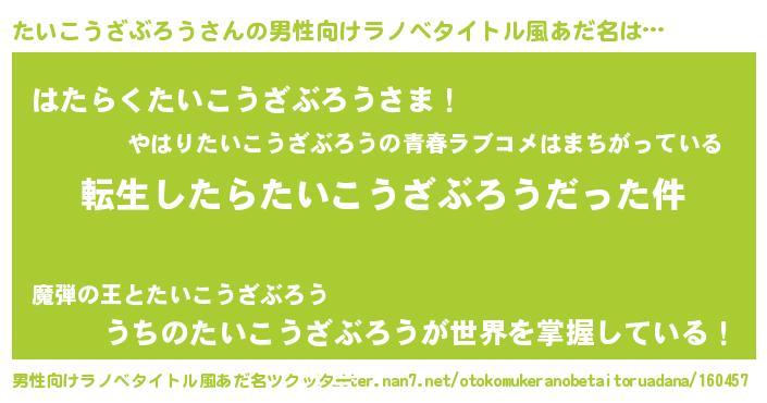 | 女子向けラノベタイトル風あだ名 | 『たいこうざぶろうの玉の輿計画!』 |