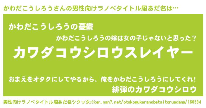 | 胡散臭い通販商品みたいなあだ名 | 『必ず成功する霊験あらたかなお札…その名も「かわだこうしろう」』 |